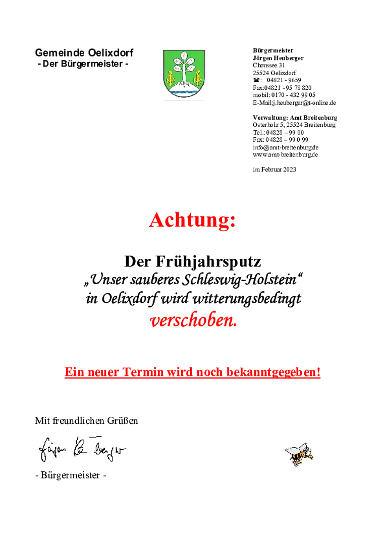 Witterungsbedingt wird die Aktion "Sauberes Schleswig-Holstein" in Oelixdorf verschoben. Ein neuer Termin steht noch nicht fest.