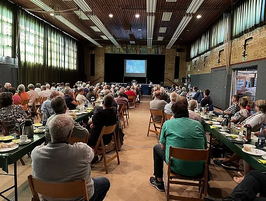 Der Vortrag vom Leiter des Lägerdorfer Heimatmuseums, Uwe Erickson, über den Breitenburger Schifffahrtskanal erwies sich als absoluter Veranstaltungshit, denn der Einladung folgten 130 Personen. Bei Kaffee und Kuchen sowie Softgetränken wurden die Zuschauer durch die Historie des Breitenburger Schifffahrtskanals, dessen Spatenstich auf das Jahr 1872 zurückgeht und bereits seit 150 Jahren besteht, geführt.