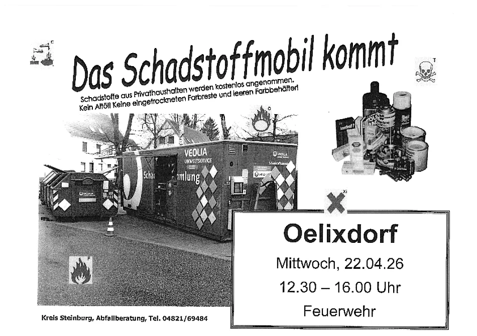 Am Mittwoch, 22.04.2026, wird in der Zeit von 12.30 - 16.00 Uhr das Schadstoffmobil an der Feuerwache in Oelixdorf stehen.