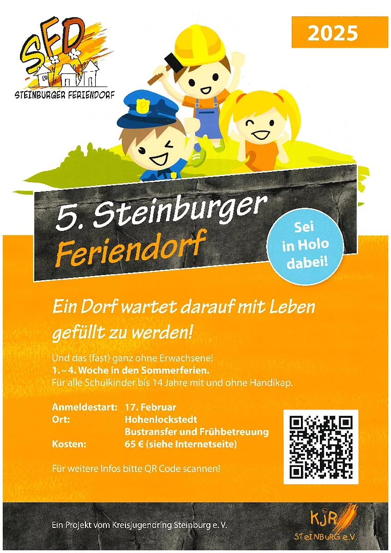 In den Sommerferien wird wieder das Steinburger Feriendorf angeboten. Schulkinder bis 14 Jahren erhalten hier die Möglichkeit, die komplexen Zusammenhänge eines Dorfes wirklichkeitsnah zu erleben, indem sie ein neues und eigenes Dorf mit Leben füllen.